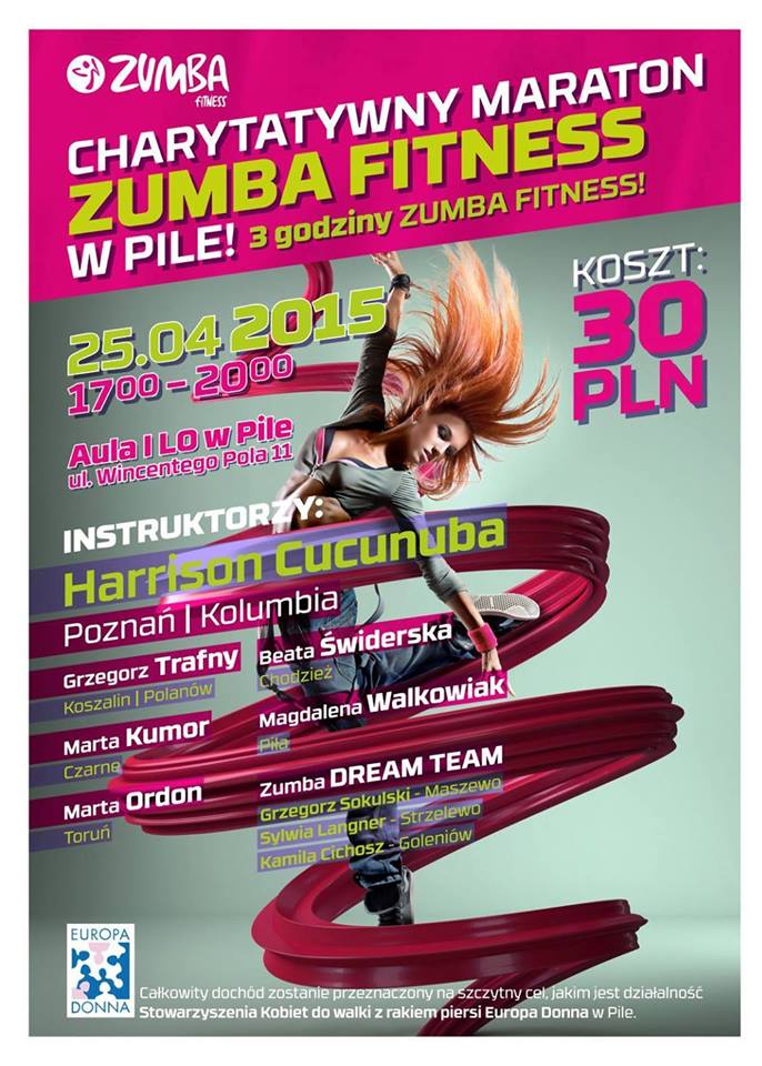 Zapraszamy na Charytatywny Maraton Zumba Fitness organizowany na rzecz naszego Stowarzyszenia EUROPA DONNA w Pile.