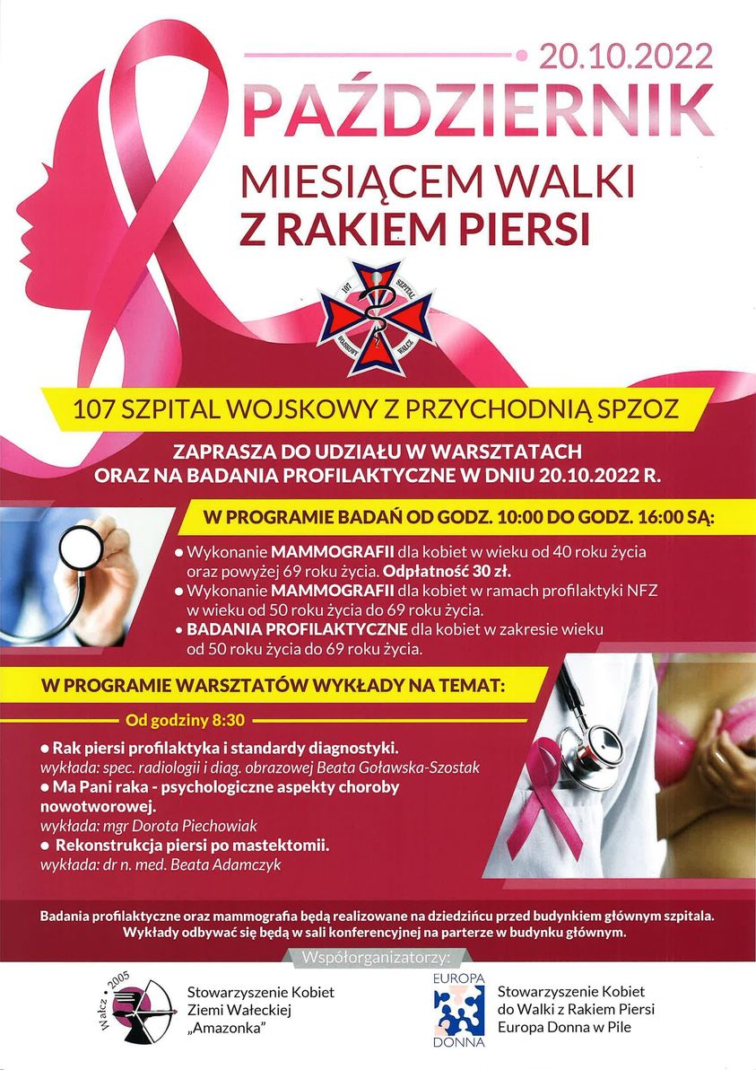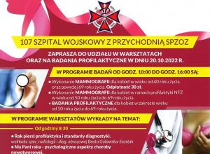 20 października 2022 roku 107 Szpital Wojskowy z SPZOZ w Wałczu zaprasza do udziału WARSZATACH oraz BADANIACH PROFILAKTYCZNYCH.
