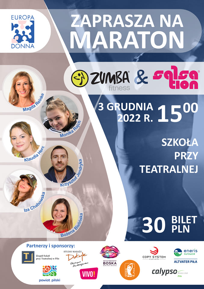 Już za tydzień zapraszamy serdecznie na Charytatywny Maraton Zumba Fitness i Salsation dla Stowarzyszenia Kobiet do Walki z Rakiem Piersi Europa Donna. Gwarantujemy świetną taneczną zabawę, losowanie nagród od naszych wspaniałych sponsorów, a także możliwość nauki badania piersi oraz zapisania się na badania profilaktyczne. Zapraszamy wszystkich bez względu na wiek i płeć. Dołączcie do nas całą rodziną, zróbcie coś dla siebie i innych w ten grudniowy przedświąteczny czas.