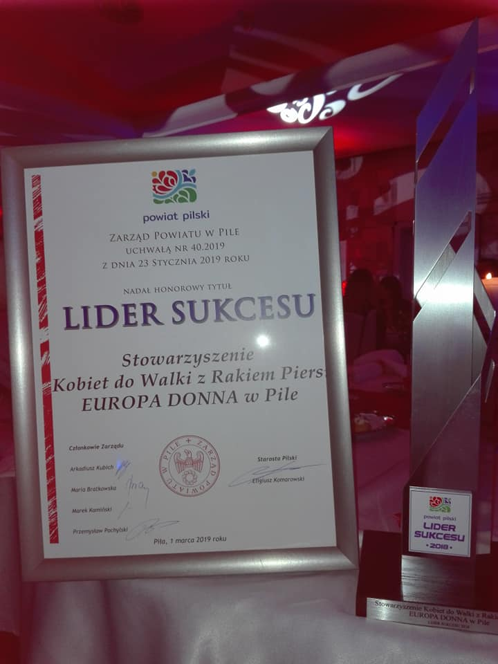 Wczoraj, 1 marca 2019 r. nasze Stowarzyszenie Europa Donna w Pile otrzymało zaszczytny tytuł Lidera Sukcesu 2018. Nasza 10-letnia działalność na rzecz zdrowia kobiet została doceniona przez Powiat Pilski. Dziękujemy 😊